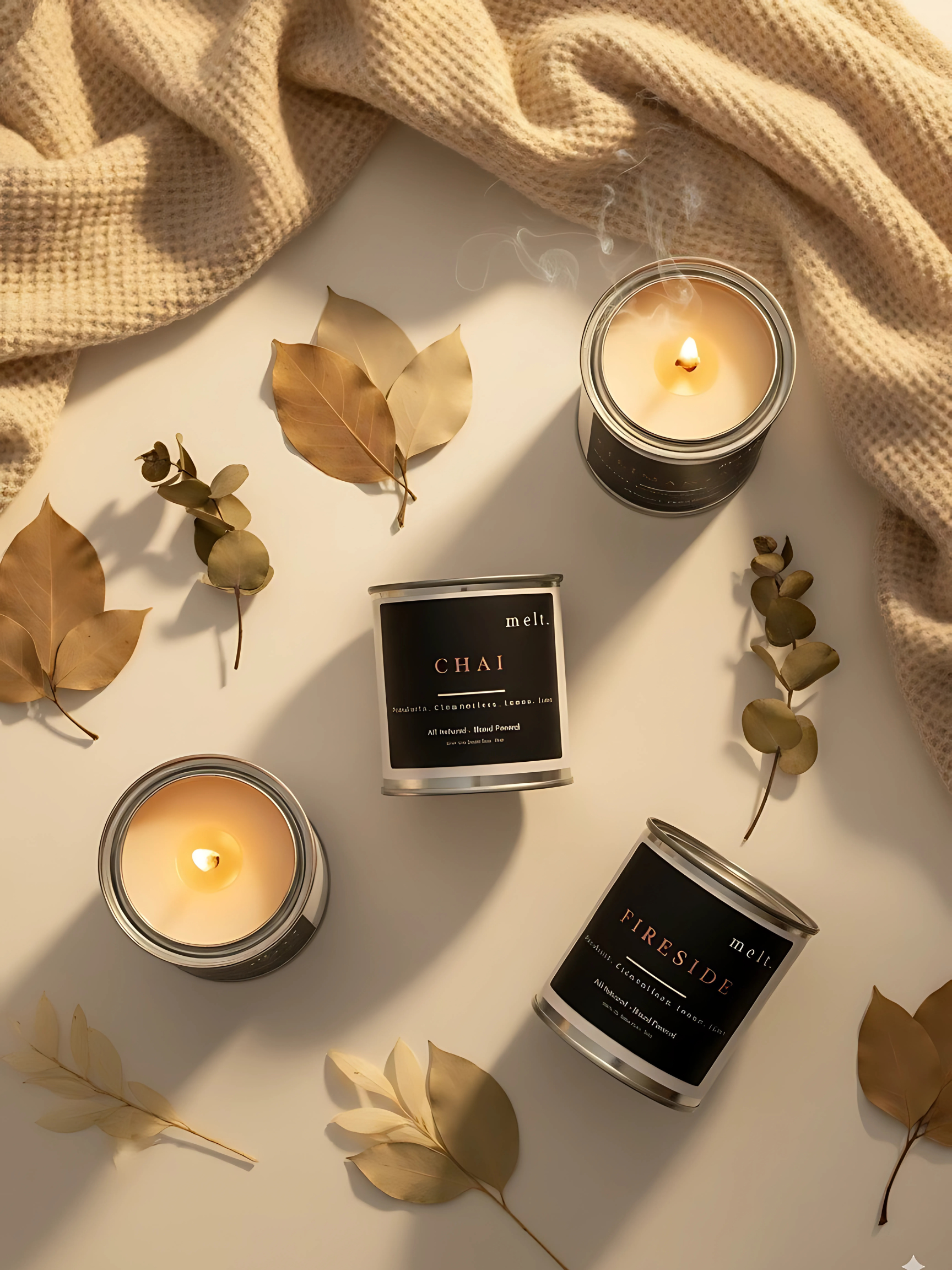Light Up Fall Subtle warmth. Chic simplicity. Candles that feel like home. Shop Fall into melt.Cozy nights, crisp air, and candles that capture the magic of autumn. Our Fall Collection brings together the best of the season. Warm, spiced, and perfectly seasonal. Eco-Friendlysoy wax + recyclable tins Clean Burnwooden wicks, no toxins Crafted In The USAsmall-batch, hand-poured Minimal Designmodern tins that double as décor Long-Lastingslow, even burn with cozy crackle melt. Vibe